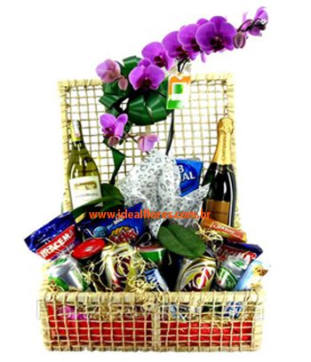 -Linda cesta Baú com bebidas, aperitivos salgados e doces. Acompanha Chandon Baby e orquídea.