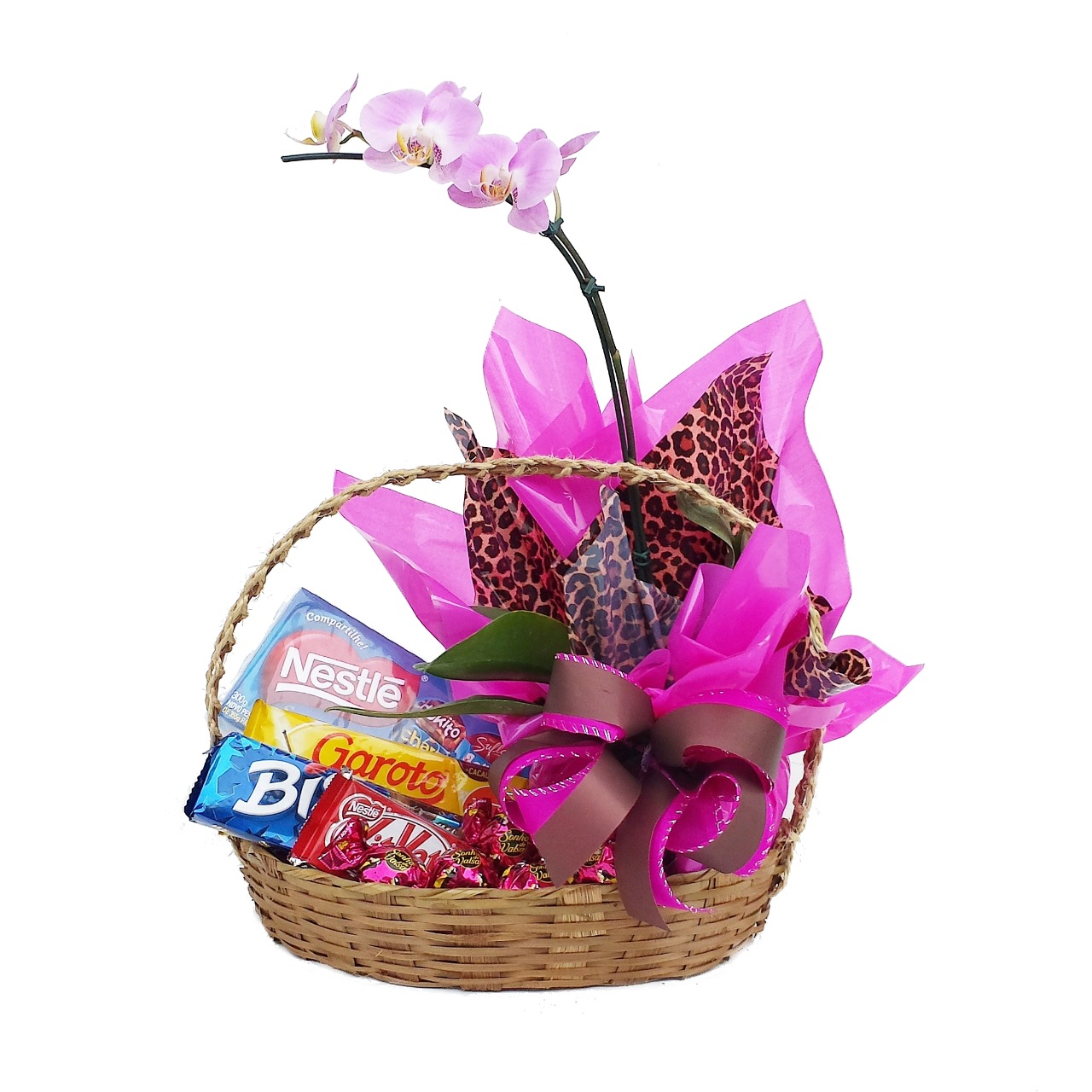 Cesta Rústica com uma linda Orquídea Phalaenopsis e Chocolates!