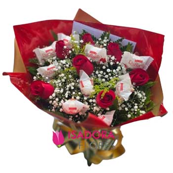 Buquê de rosas vermelhas com deliciosos Bombons Raffaello, embalagem vermelha e laço dourado.